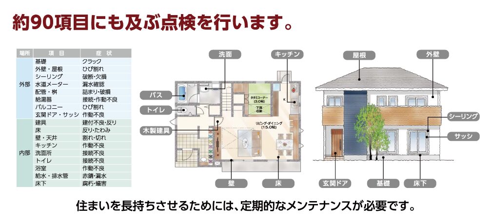 お引渡し後も、建物の劣化・不具合・安全性について数十項目にわたる点検を行います。